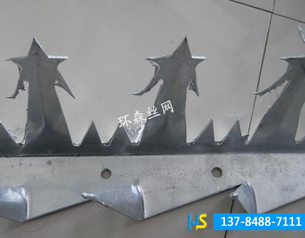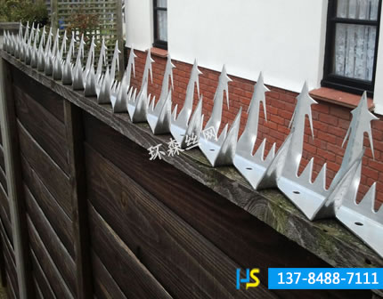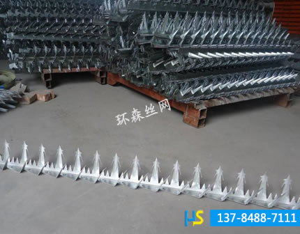 刺釘?shù)陌惭b與制作:本公司自主研發(fā)的全自動生產(chǎn)設(shè)備,經(jīng)過特殊模具沖壓而成,一次性成型,彎曲度精確,強度高,外表美觀,防護系數(shù)高,用膨脹螺絲固定在墻頭或者金屬護欄上,安裝方便。